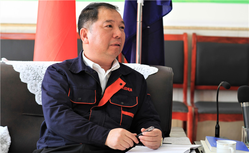 图为公司董事长蔡天志介绍企业发展情况