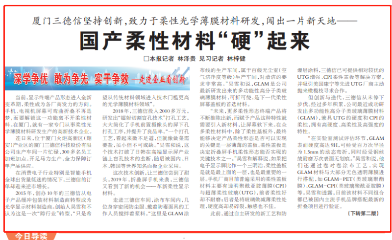 为大力宣传中国制造“隐形冠军”,推广隐形冠军企业的奋斗历程、成功经验和发展模式,引导制造业高质量发展,《福建日报》与【三亿官方官网三亿(中国)_三亿(中国)】联合陆续推出“隐形冠军”专题报道。以下是专题报道第一篇厦门三德信(协会会员企业)的宣传报道,《国产柔性材料“硬”起来——厦门三德信坚持创新,致力于柔性光学薄膜材料研发,闯出一片新天地》,刊发于今日《福建日报》头版。