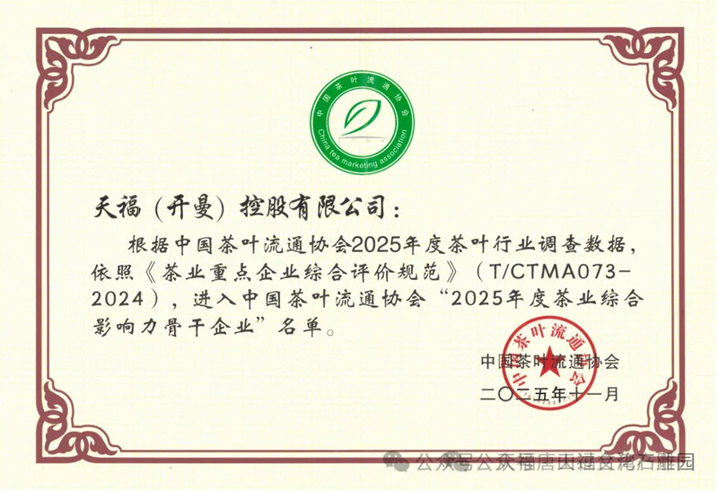 会上发布了中国茶叶流通协会2025年度茶叶行业调查结果,并颁发了相关奖项。天福集团(天福开曼控股有限公司)被授予“2025年度茶业综合影响力骨干企业”及“2025年茶业重点企业”荣誉称号。